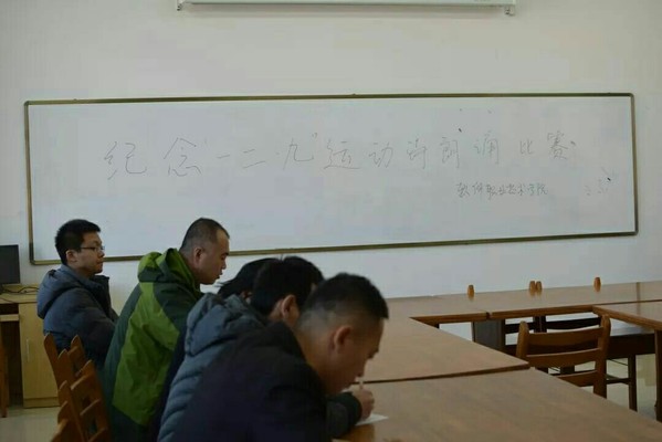 2018年12月12日,在北湖应用楼413,召开了关于“纪念一二·九运动诗朗诵比赛”会议,会议内容如下: 为纪念一二·九运动,软件职业技术学院学生第二支部于2018年12月12日上午10点在应用楼413展开诗朗诵比赛。参加本次支部比赛的评委老师有:OK138太阳集团党委专职组织员张建光老师,支部书记霍阳老师OK138太阳集团辅导员田贺老师、田兵老师、李明超老师。各位党员都认真准备,用最饱满的精神状态,最积极的态度来迎接此次比赛。