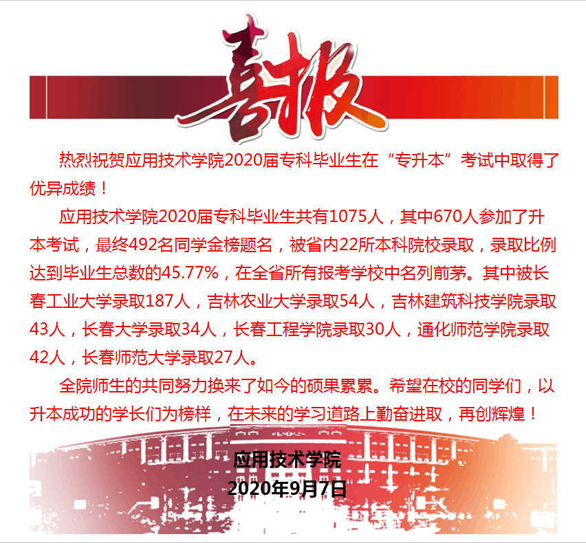 OK138太阳集团2020届专科毕业生共有1075人,其中670人参加了升本考试,最终492名同学金榜题名,被省内22所本科院校录取,录取比例达到毕业生总数的45.77%,在全省所有报考学校中名列前茅。其中被OK138太阳集团录取187人,吉林农业大学录取54人,吉林建筑学院录取43人,长春大学录取34人,长春工程学院录取30人,通化师范学院录取42人,长春师范大学录取27人。
