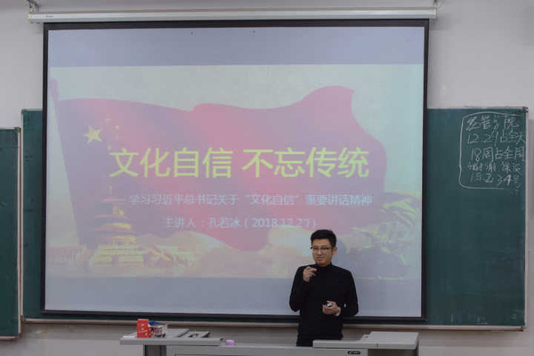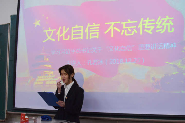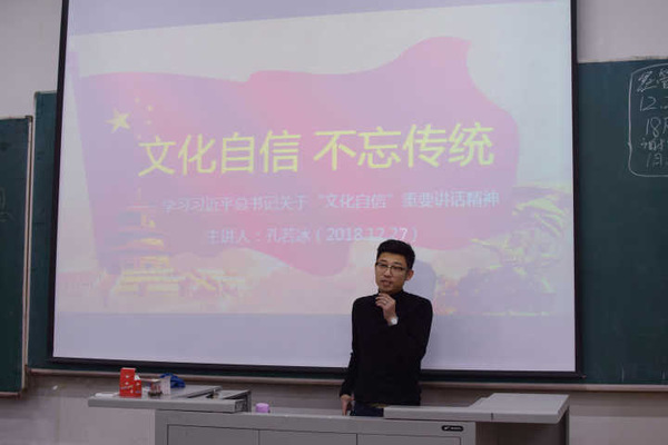 会上,孔老师强调,我们作为中国人,要坚定文化自信,保护中国传统优秀文化,正如习近平总书记所说“没有高度的文化自信,没有中华文化繁荣兴盛,就没有中华民族伟大复兴。” 因此,我们每一个人都要增强文化自信,自觉继承并发扬中华民族传统文化,从而让中华民族的优秀文化立足于世界前列,更好的巩固中国特色社会主义的发展。