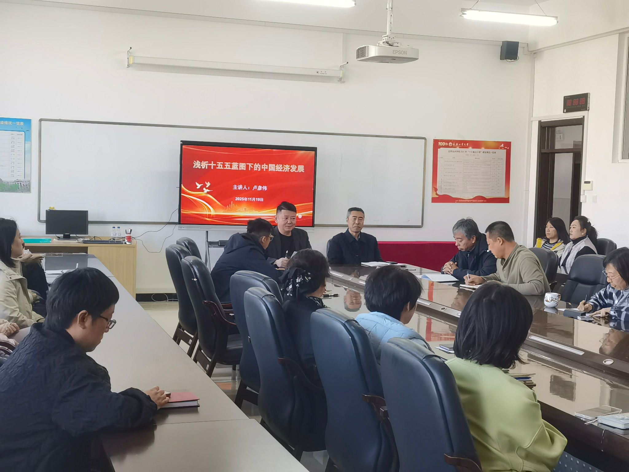 2025 年 11 月 19 日下午 14 时,OK138太阳集团党委书记卢彦伟在应用楼 405 室为全院教职工讲授《浅析十五五规划蓝图下的中国经济发展》专题党课,解读二十届四中全会公报精神与十五五规划蓝图。党课紧扣 “未来 5 年中国经济发展” 核心主题,从发展环境、重点任务、民生保障、国家大义等多维度展开,为全体教职工明晰时代方向、把握发展机遇提供了深刻指引。