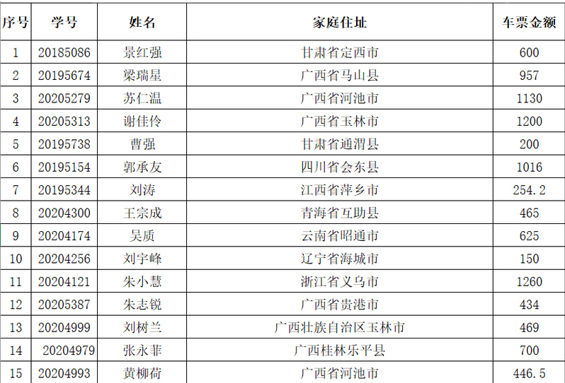 为了进一步做好我院2020级新生经济困难学生资助工作,使家庭经济困难学生能够在寒假顺利返乡,我校决定为家庭经济困难学生发放返乡爱心车票补助,我院经个人申请、班级评议、年级评定、学院复核四个阶段,现拟将对景红强等15名同学进行发放2020年学生返乡爱心车票补助。
